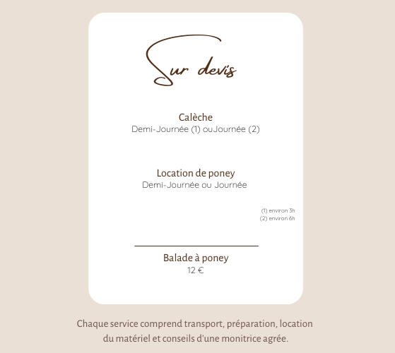 Je suis Camille, une passionnée de chevaux depuis ma plus tendre enfance, et avec ma jument de trait Breton, Surprise, nous avons créé cette petite "entreprise" familiale de calèche.Nous participons à plusieurs événements dans les environs.Contactez-nous dès aujourd'hui pour obtenir plus d'informations à propos de nos services.
